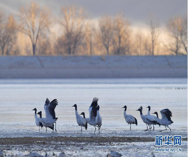 在西藏拉薩市林周縣卡孜水庫(kù)棲息的黑頸鶴(2021年1月3日攝)。