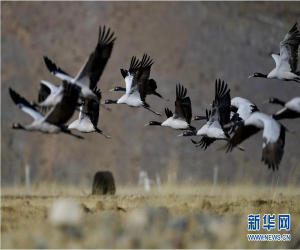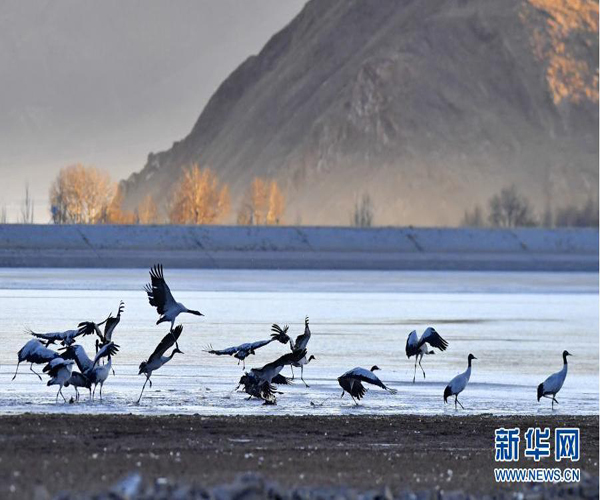 冬日,大批黑頸鶴在西藏拉薩市林周縣境內(nèi)棲息、覓食。 林周縣黑頸鶴自然保護(hù)區(qū)建立于1993年,2003年被設(shè)立為國(guó)家級(jí)自然保護(hù)區(qū),是雅魯藏布江中游自然保護(hù)區(qū)的核心部分,在每年的11月底至12月初,這里便會(huì)迎來成群的黑頸鶴過冬。