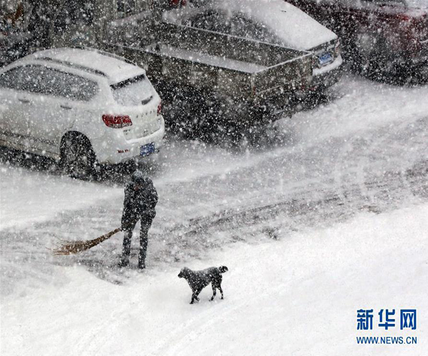 1月5日,山東煙臺街頭,一名市民在雪中清掃路面。 當日是小寒節(jié)氣,受強冷空氣影響,山東煙臺迎來降雪。