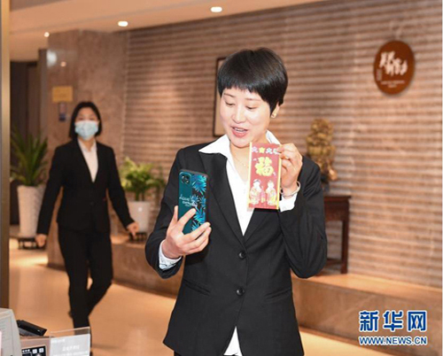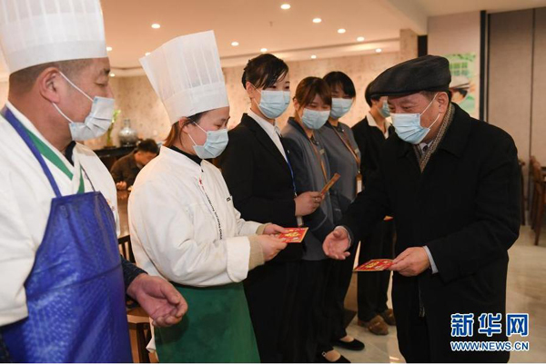 1月22日,一家酒店工會(huì)主席為就地過(guò)年的外地員工送上暖心紅包。新華社記者 翁忻旸 攝