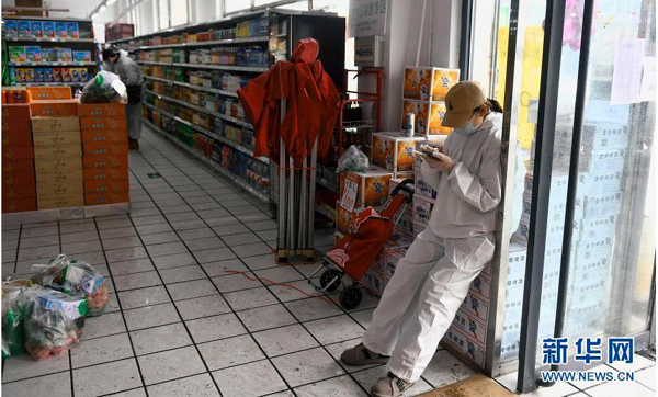 在通化市東昌區(qū)一家連鎖超市內(nèi),一名志愿者靠坐在門旁,與居民聯(lián)系確定配送地點(diǎn)(1月26日攝)。