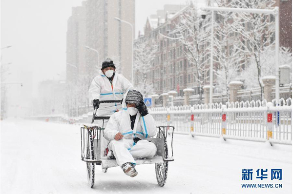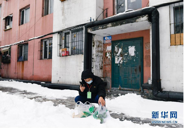 在通化市東昌區(qū)老站街道,社區(qū)工作人員為一居民小區(qū)運(yùn)送生活物資時(shí)與居民聯(lián)絡(luò)(1月26日攝)。