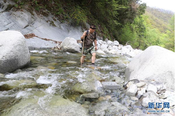 何禮文在巡護途中徒步過水(資料圖片)。新華社發(fā)