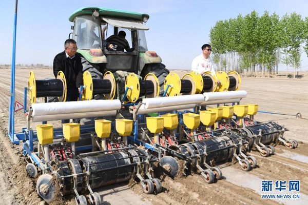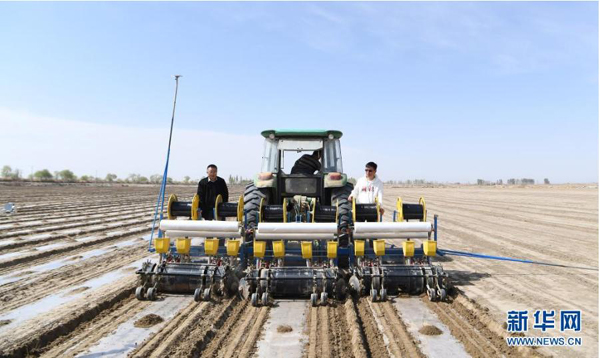 中國(guó)農(nóng)業(yè)科學(xué)院棉花研究所生物技術(shù)研究室主任袁有祿(左)、國(guó)家棉花產(chǎn)業(yè)聯(lián)盟副理事長(zhǎng)王進(jìn)華在喀什地區(qū)莎車縣指導(dǎo)播種(4月11日攝)。
