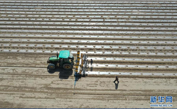 棉農(nóng)在喀什地區(qū)莎車縣播種“中棉所127”品種棉花(4月11日攝,無(wú)人機(jī)照片)。