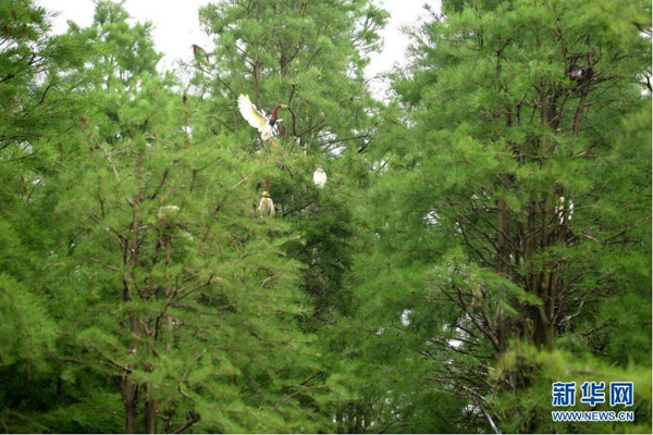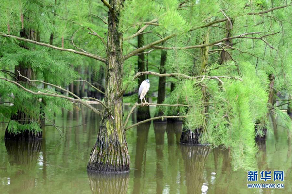 5月12日,在池杉湖國家濕地公園內(nèi),鳥兒在池杉林間休息。