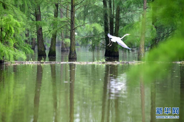 5月12日,在池杉湖國家濕地公園內(nèi),鳥兒在池杉林間飛舞。