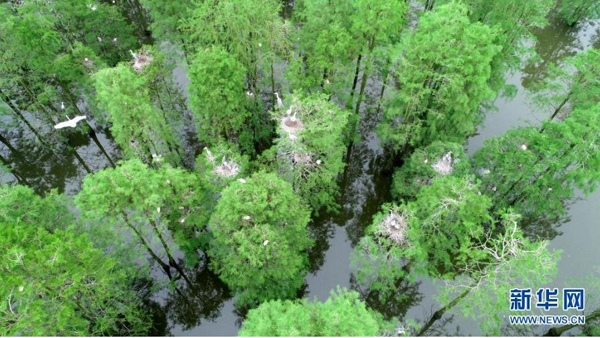 5月12日,在池杉湖國家濕地公園內(nèi),鳥兒在池杉林間休息(無人機(jī)照片)。