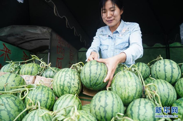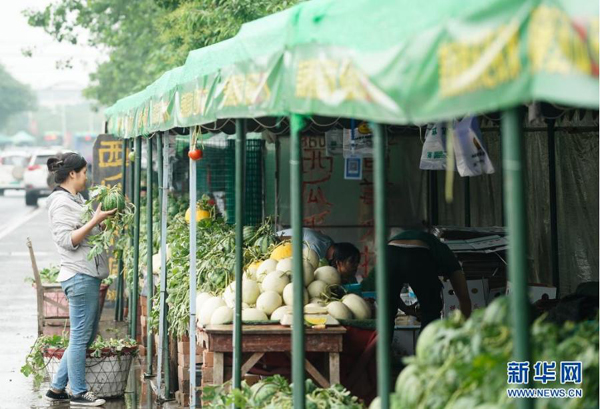 5月23日,在南京市江寧區(qū)橫溪街道,瓜農(nóng)在整理攤位。