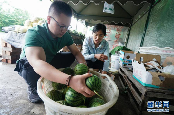 5月23日,在南京市江寧區(qū)橫溪街道,顧客(左)在挑選西瓜。