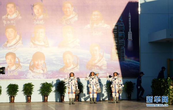 6月17日,神舟十二號(hào)航天員出征儀式在酒泉衛(wèi)星發(fā)射中心舉行。這是航天員聶海勝(中)、劉伯明(右)和湯洪波在出征儀式上揮手。新華社記者 琚振華 攝