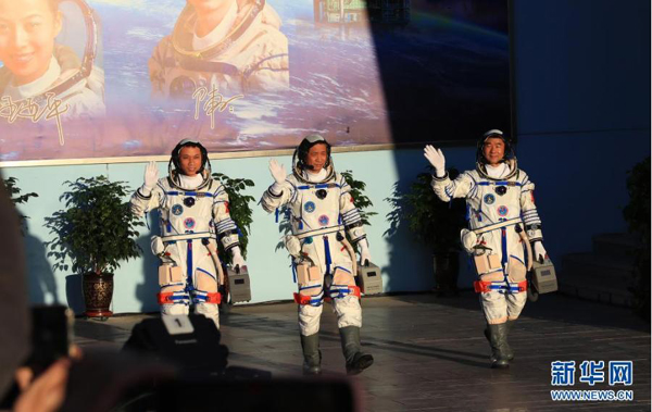 6月17日,神舟十二號(hào)航天員出征儀式在酒泉衛(wèi)星發(fā)射中心舉行。這是航天員聶海勝(中)、劉伯明(右)和湯洪波準(zhǔn)備出征。新華社記者 李剛 攝