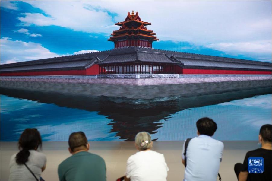 9月7日,觀眾在故宮博物院展位觀看故宮角樓建筑工藝視頻。
