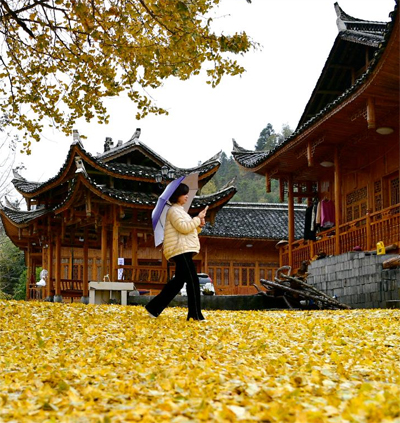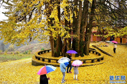 11月8日,游人在湖北省宣恩縣珠山鎮(zhèn)東門(mén)關(guān)村農(nóng)家院落前的古銀杏樹(shù)下游玩。