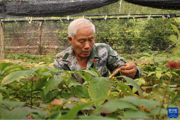 山東威海文登退役軍人王文水在種植基地查看西洋參苗的生長情況(9月1日攝)。新華社發(fā)