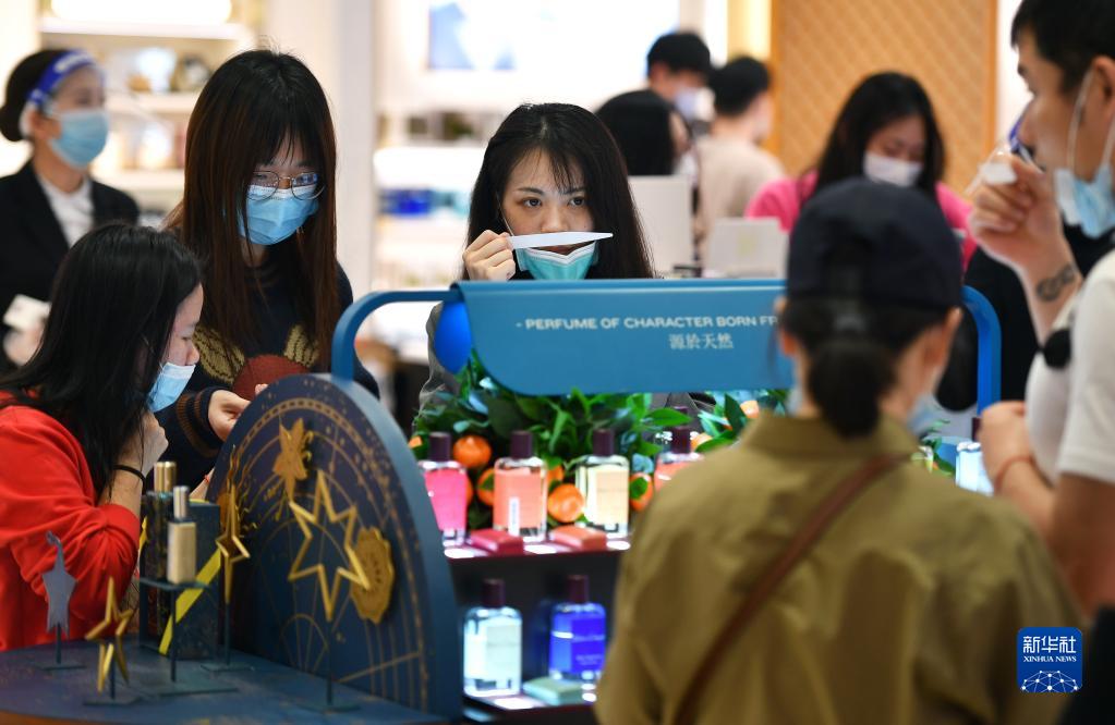 1月3日,顧客在??谌赵聫V場免稅店選購香水。