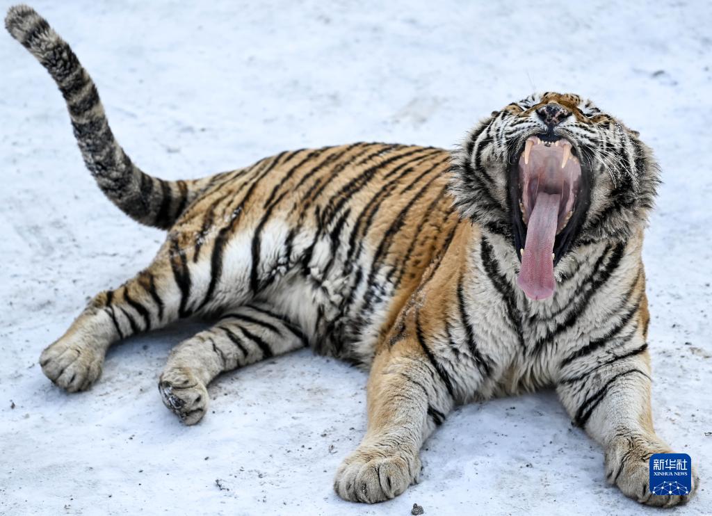 1月13日,在吉林省東北虎園內(nèi),一只東北虎在伸懶腰。