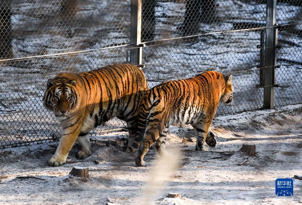 1月13日,在吉林省東北虎園內(nèi),兩只東北虎在雪地上踱步。