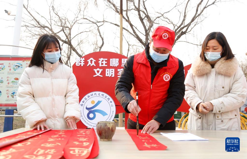 1月19日,在河北省邢臺(tái)市南和區(qū)新時(shí)代文明實(shí)踐中心,黨員志愿者為居民書寫春聯(lián)。