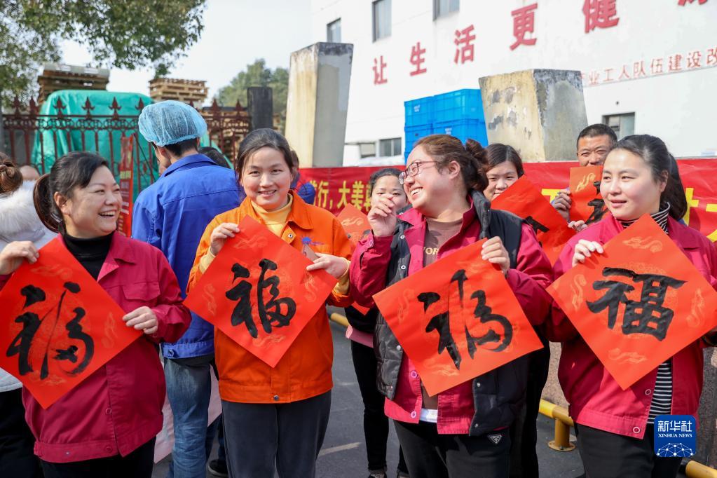 1月19日,在浙江省湖州市德清縣一塑料制品企業(yè),員工展示當(dāng)?shù)毓?huì)送來的福字。