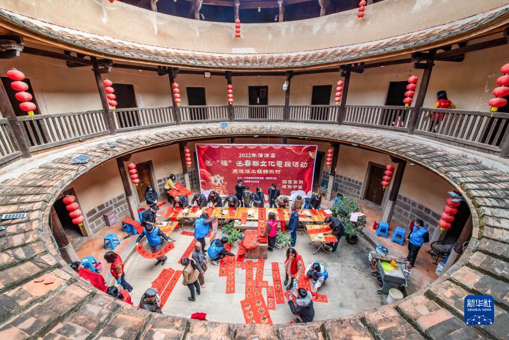 1月18日,在福建省漳浦縣錦東村錦江樓內(nèi),書法愛好者為居民寫春聯(lián)。