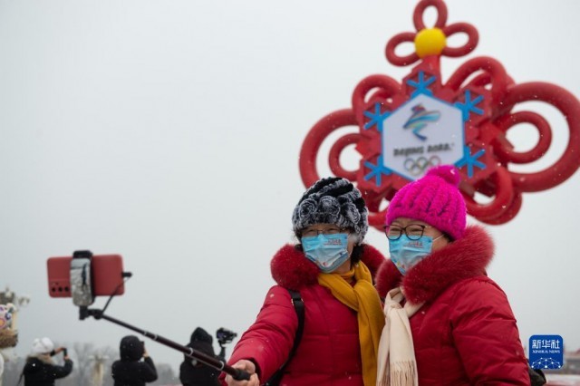 1月20日,游客在北京天安門廣場(chǎng)“精彩冬奧”主題花壇前拍照留念。新華社記者 陳鐘昊 攝