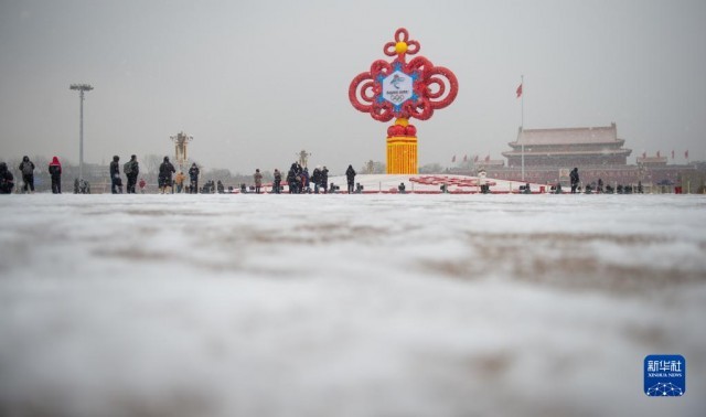 1月20日拍攝的北京天安門廣場(chǎng)“精彩冬奧”主題花壇。當(dāng)日是大寒節(jié)氣,北京迎來(lái)降雪。新華社記者 陳鐘昊 攝