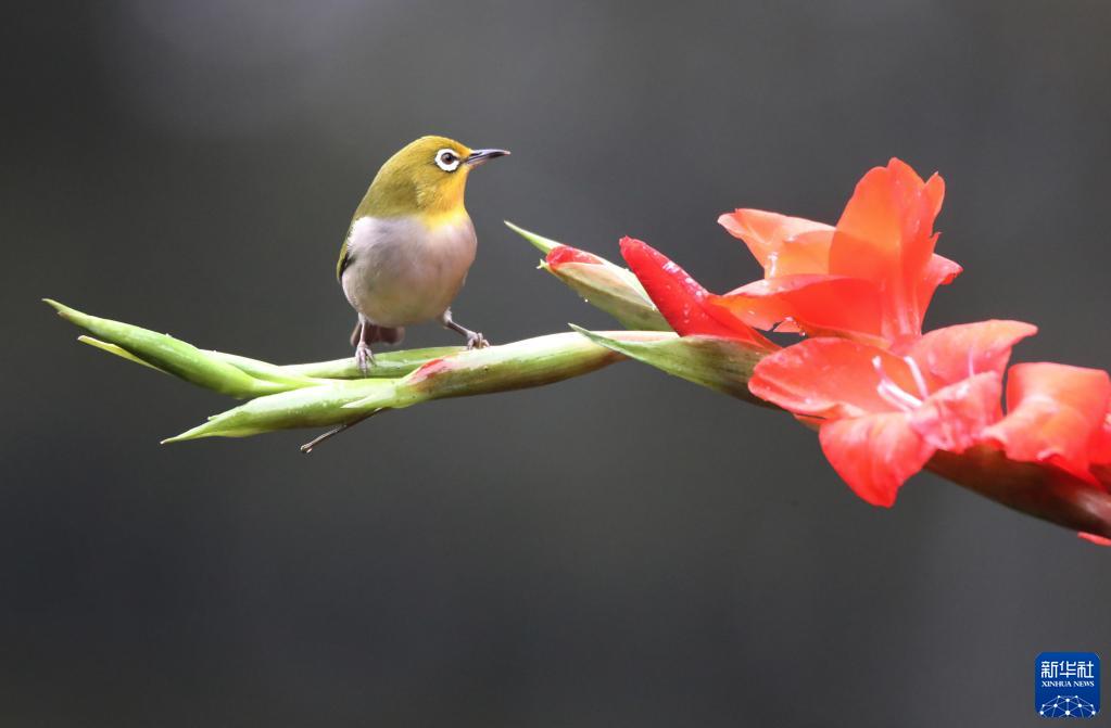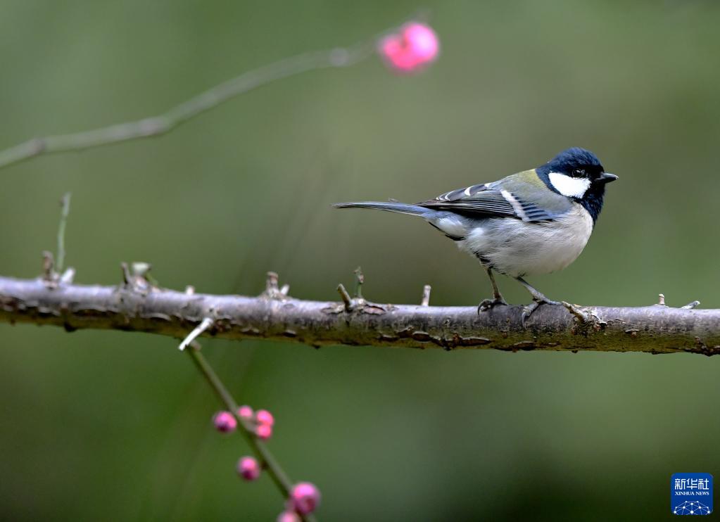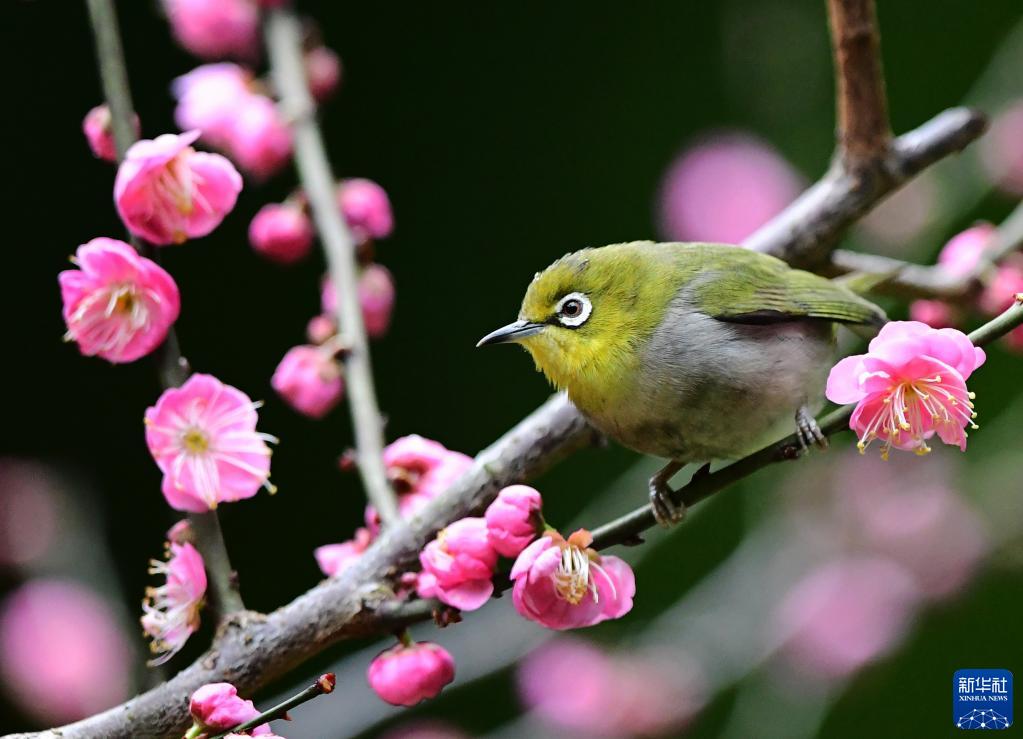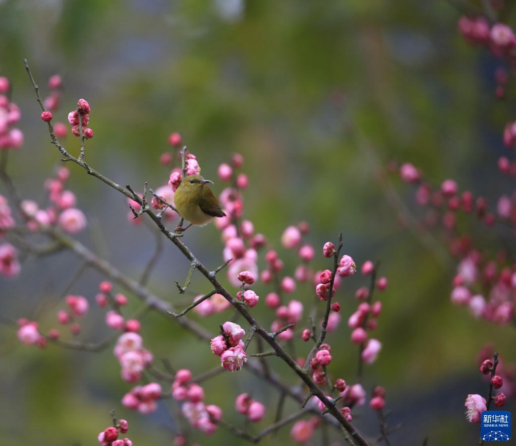 2月4日,在江蘇省無錫市管社山莊,小鳥在花間嬉戲。