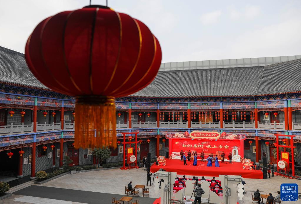 2月13日,藝人在河南省寶豐縣馬街書會景區(qū)進行線上直播表演。
