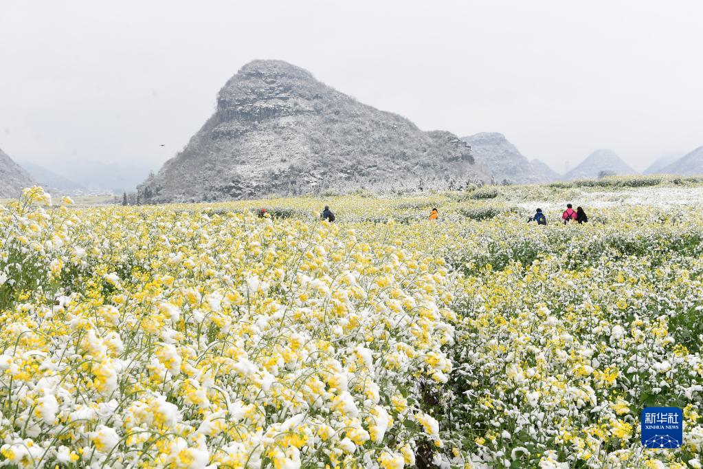 2月22日,在云南省曲靖市羅平縣板橋鎮(zhèn)金雞村,游客在雪后的油菜花田中游玩。