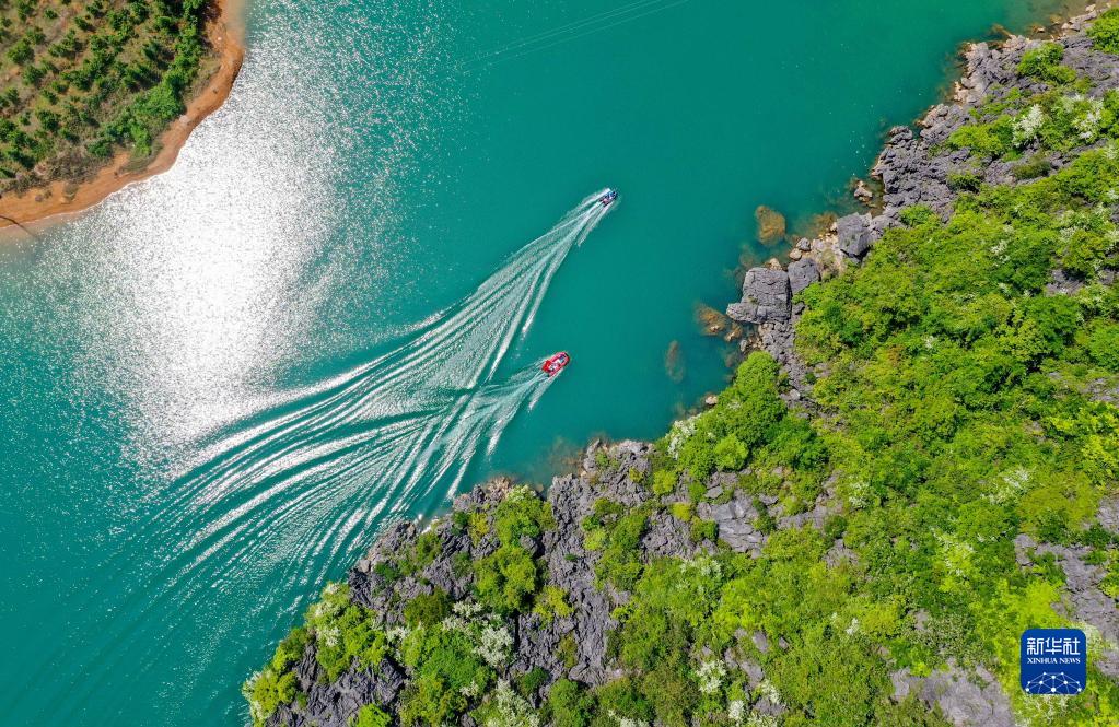4月21日,在湖南省永州市道縣壽雁鎮(zhèn)樂海水庫,護(hù)水志愿者乘坐快艇進(jìn)行水上巡查作業(yè)(無人機照片)。