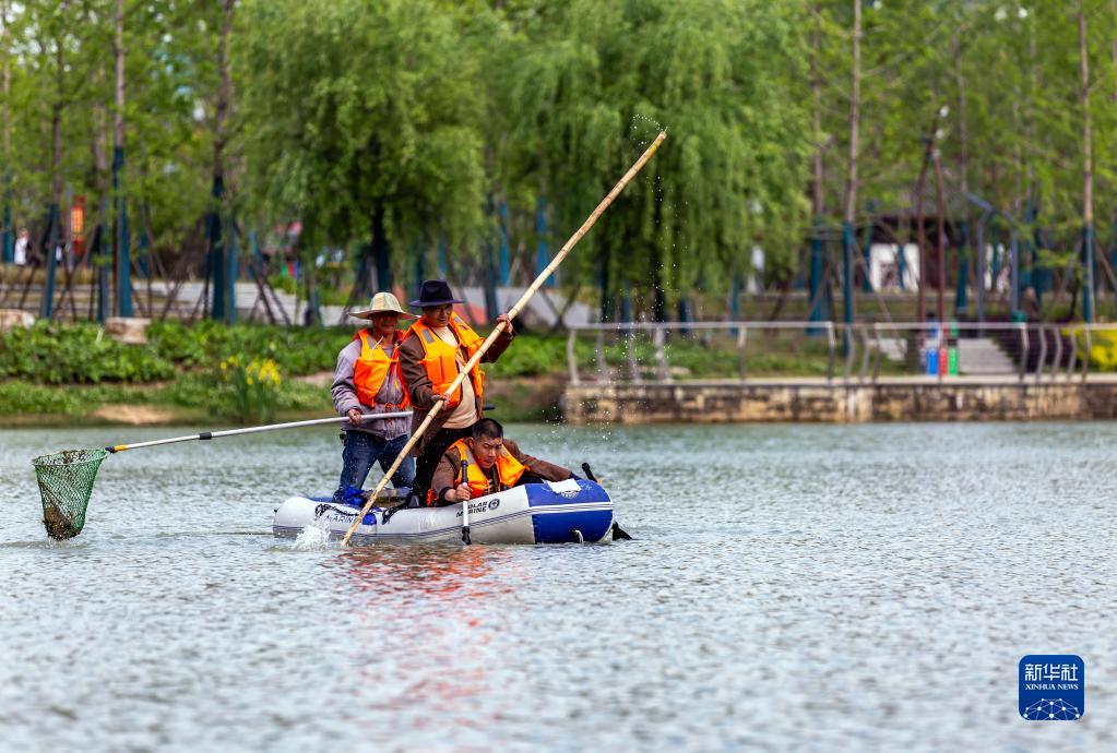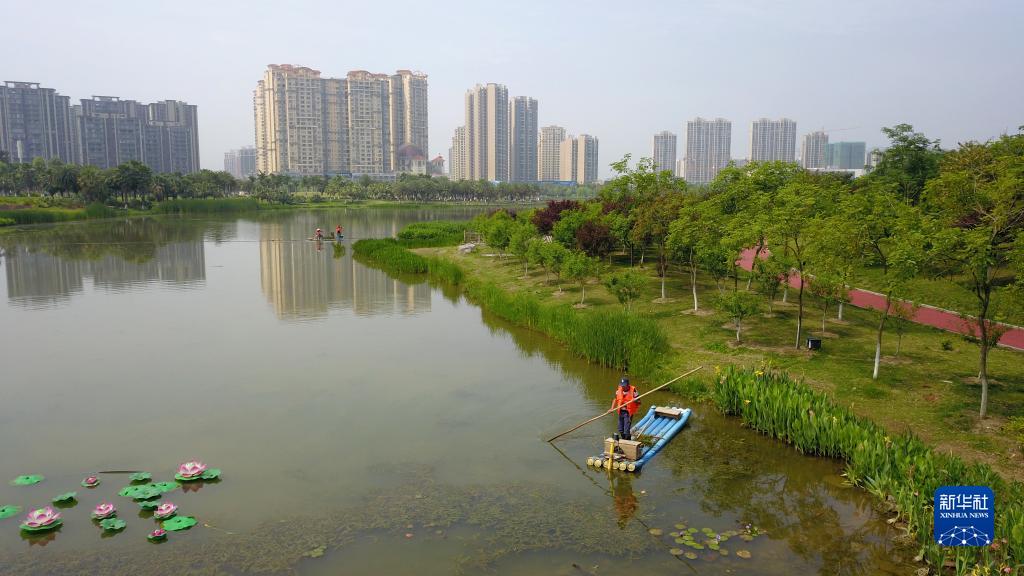4月21日,環(huán)衛(wèi)工人在貴州省黔西市杜鵑湖濕地公園進(jìn)行湖面清潔作業(yè)。