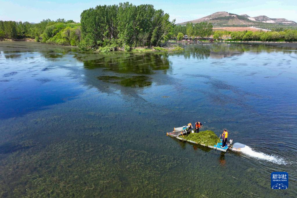 4月21日,在山東省青州市堯王湖,工作人員清理水草和垃圾(無人機照片)。