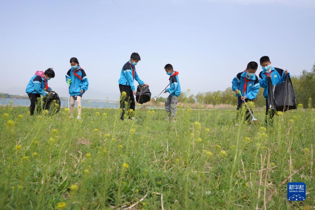 4月21日,河北省邢臺市內(nèi)丘縣柳林鎮(zhèn)中心小學(xué)學(xué)生在鵲山湖畔撿拾垃圾。