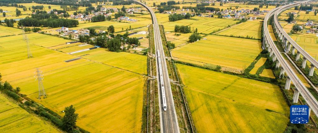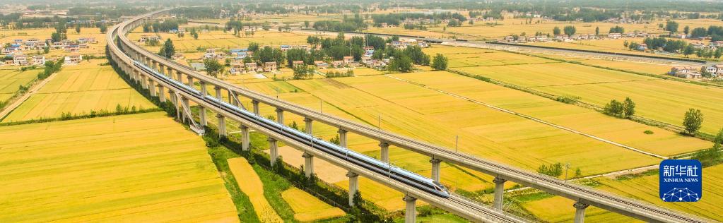 5月26日,一列高鐵列車駛過江蘇淮安即將豐收的麥田(無人機(jī)拍攝)。