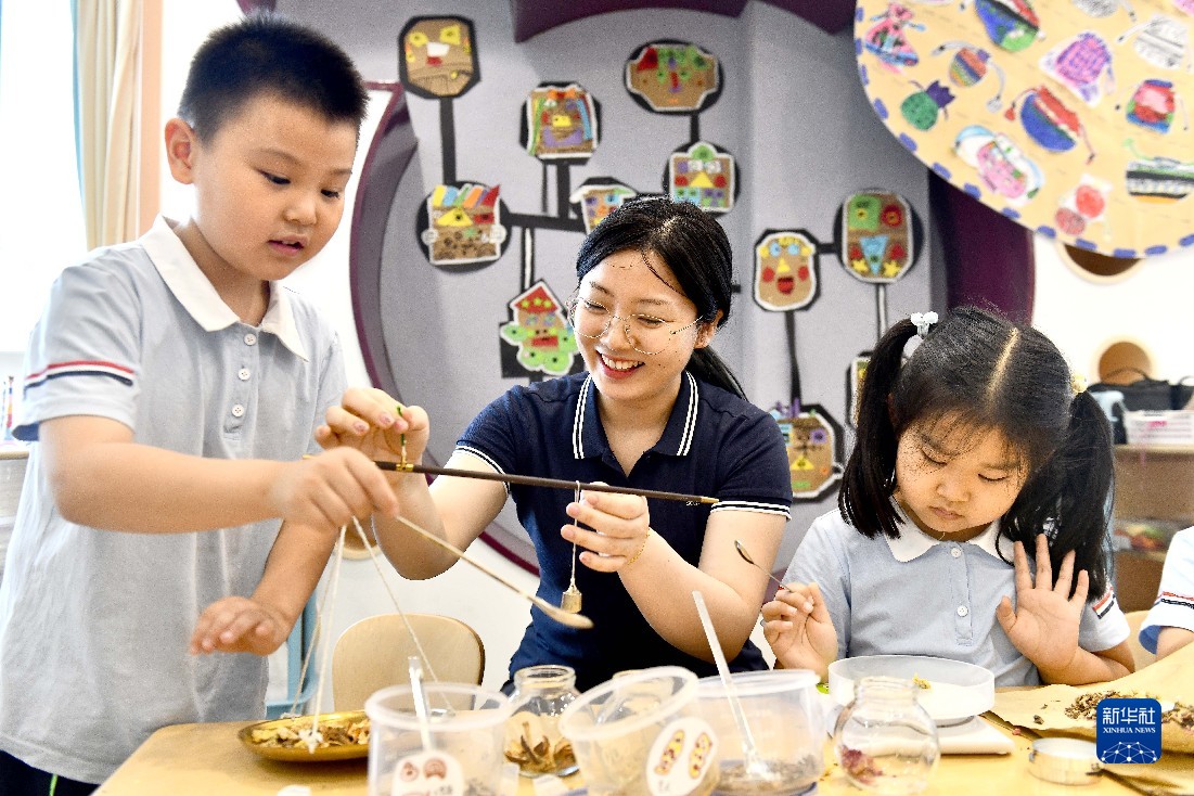 5月30日,在山東省實(shí)驗(yàn)幼兒園,老師帶著孩子們體驗(yàn)花草紙制作。新華社記者 郭緒雷 攝