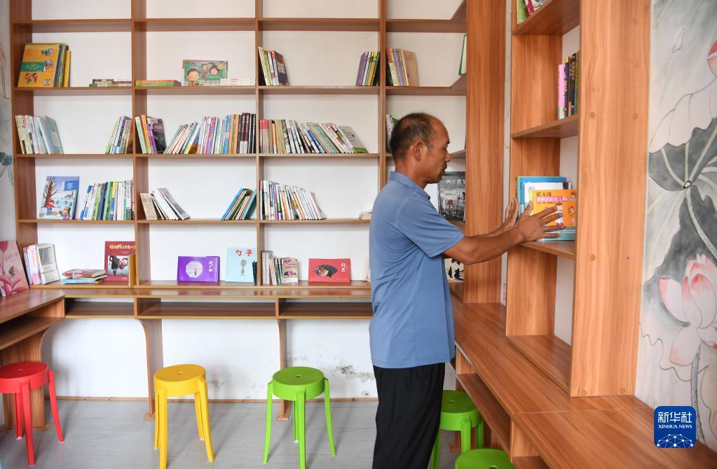 7月27日,在河南新鄉(xiāng)長(zhǎng)垣市丁欒鎮(zhèn)官路西村,管理員在農(nóng)家書(shū)屋整理書(shū)籍。