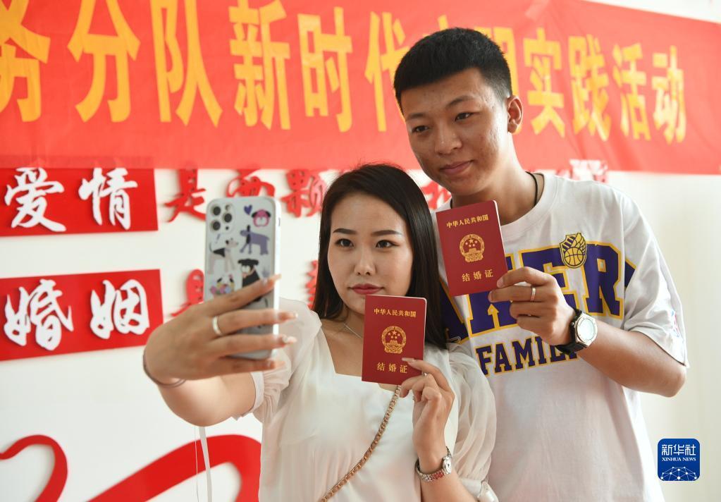 8月4日,在河北省石家莊市欒城區(qū)民政局婚姻登記處,一對新人領取結婚證后拍照留念。