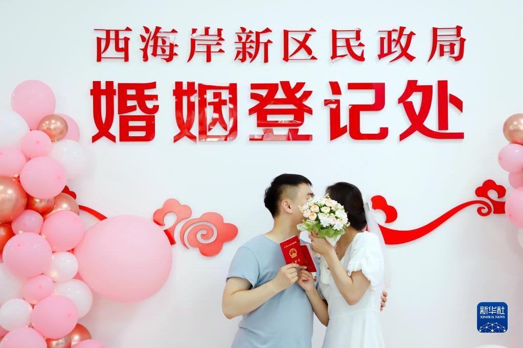 8月4日,在山東省青島市西海岸新區(qū)民政局婚姻登記處,一對新人領取結婚證后拍照留念。