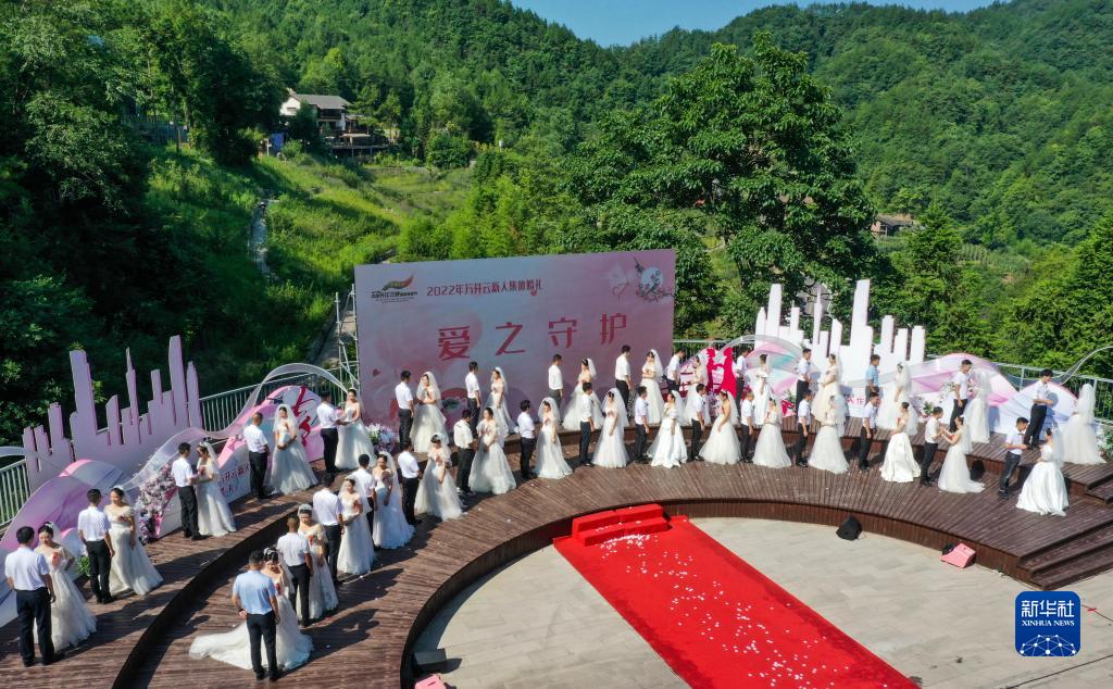 8月4日,新人在重慶萬州三峽恒合旅游度假區(qū)參加集體婚禮(無人機照片)。
