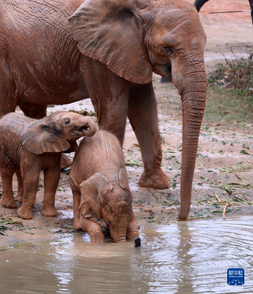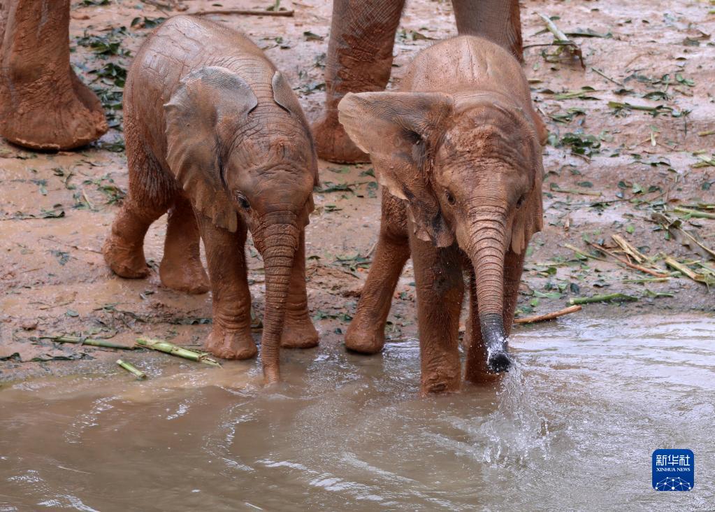 11月3日,兩頭新生非洲象寶寶在媽媽陪伴下玩水。
