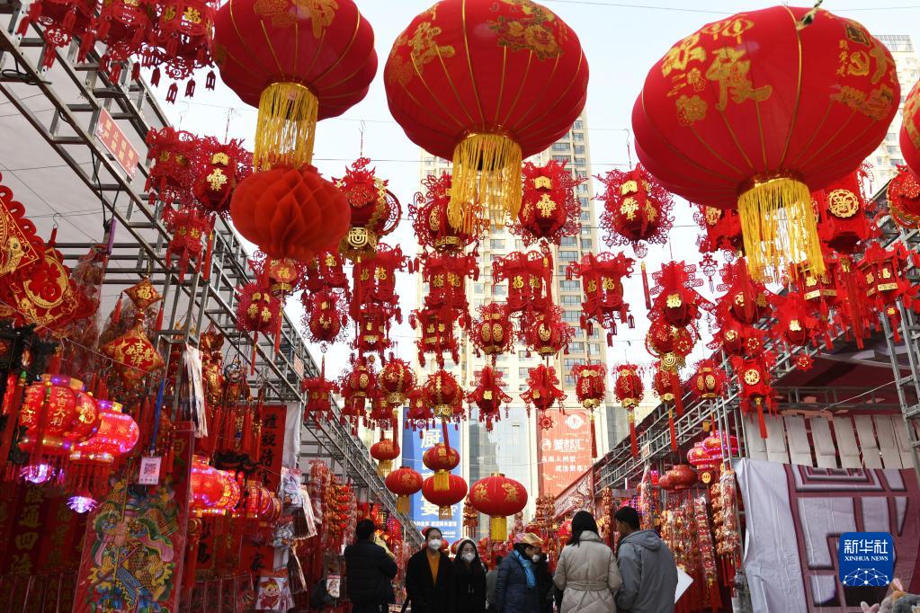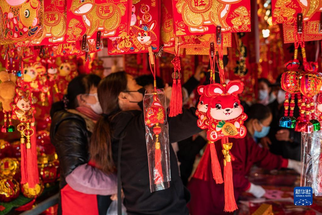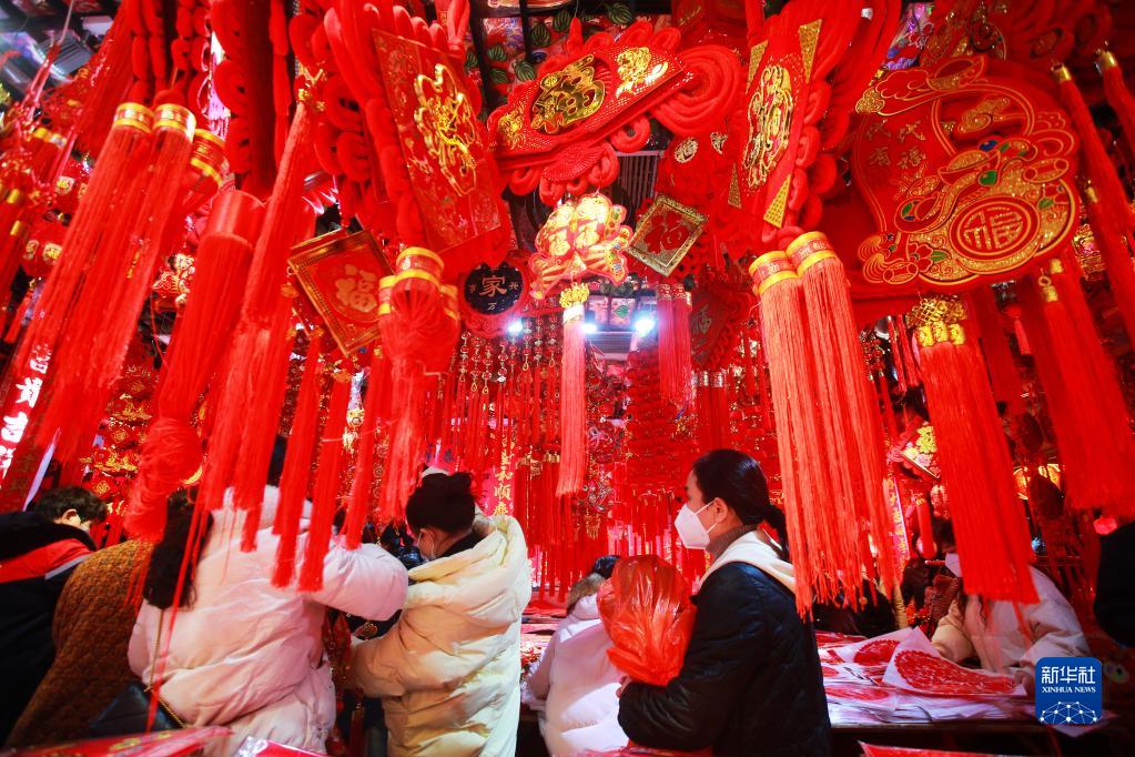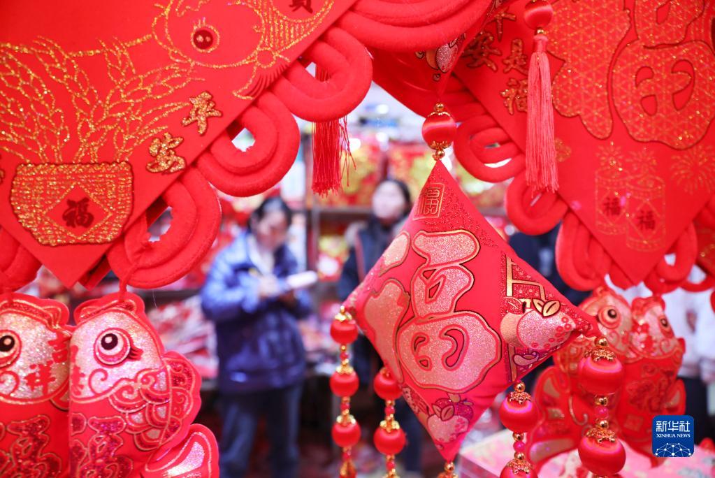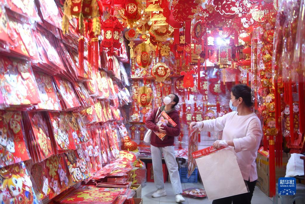 春節(jié)臨近,多地年貨市場紅火起來,人們選購春節(jié)飾品,迎接新春佳節(jié)。新華社記者 盧漢欣 攝