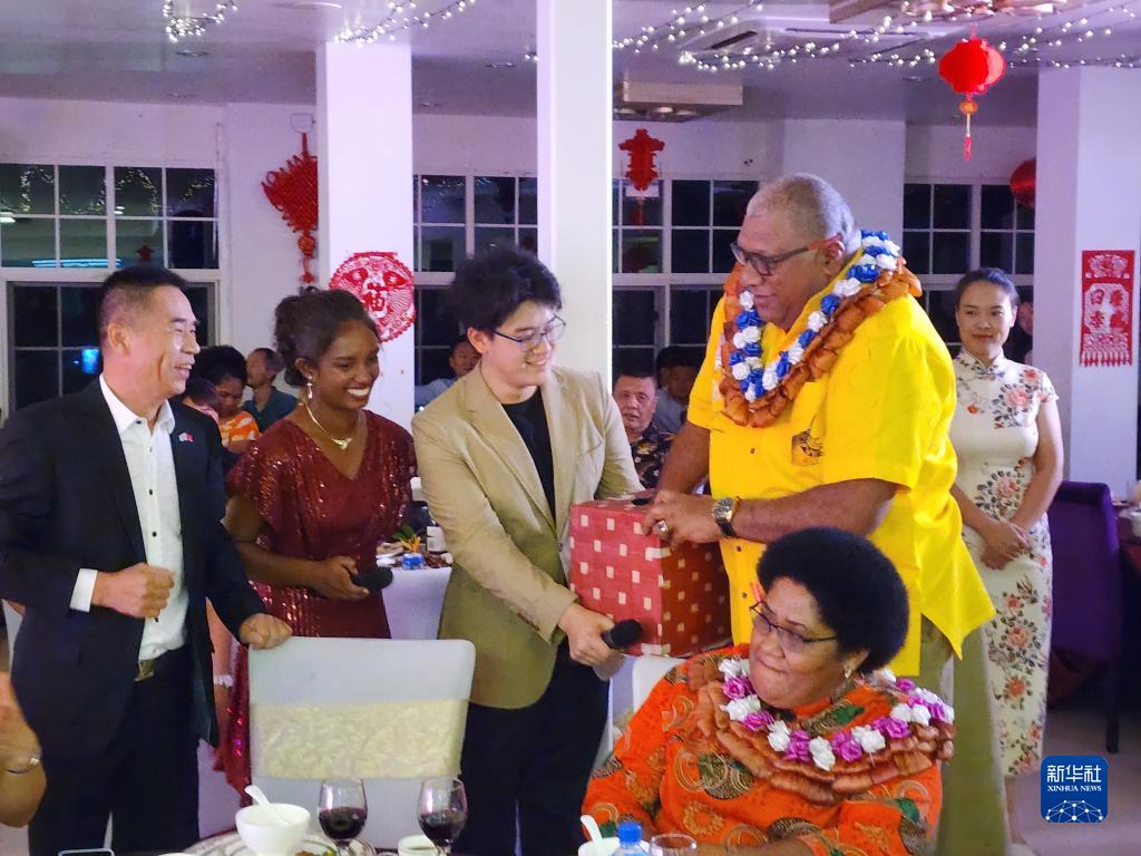 2月5日,斐濟總統(tǒng)卡托尼韋雷在蘇瓦的歡樂春節(jié)元宵聯(lián)歡會上為嘉賓抽獎。
