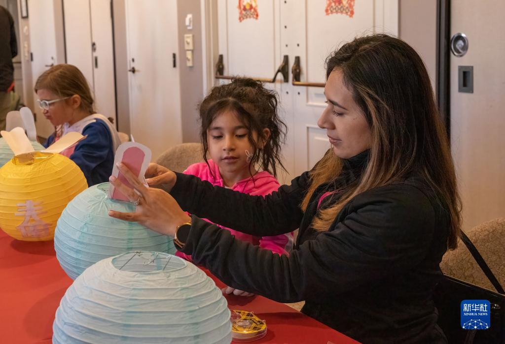 2月4日,在美國得克薩斯州紹斯萊克市的元宵節(jié)慶祝活動上,人們體驗制作燈籠。