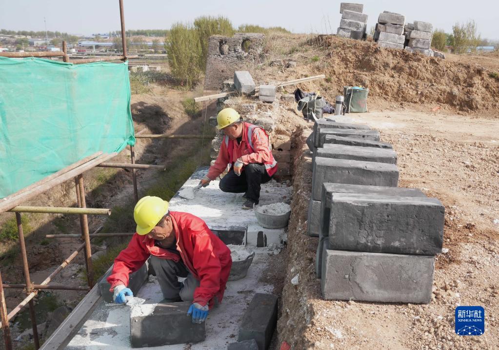 4月19日,工人在山海關(guān)長城北翼城修繕工程工地施工。