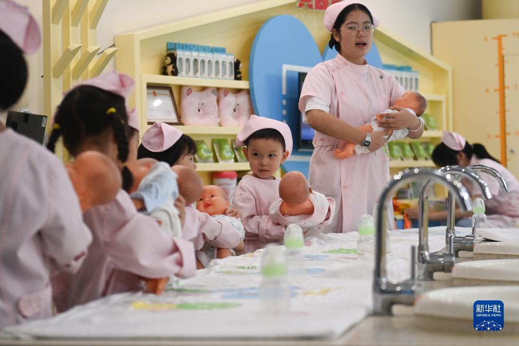 7月9日,小朋友在體驗“新生兒”護(hù)理。