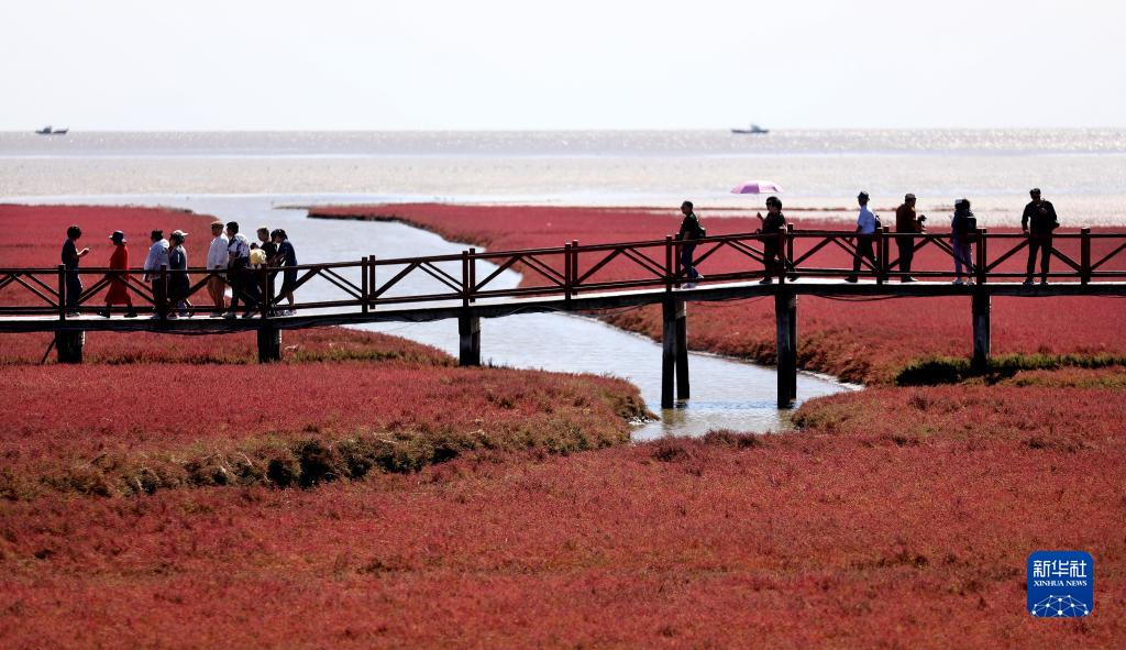 近日,遼寧省盤(pán)錦紅海灘國(guó)家風(fēng)景廊道內(nèi)的堿蓬草迎來(lái)最佳觀賞期,吸引了眾多游客前來(lái)觀賞游玩。