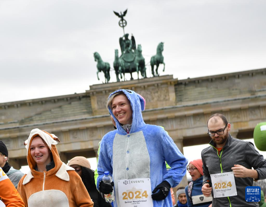 2024年1月1日,人們在德國柏林勃蘭登堡門附近參加新年跑活動。