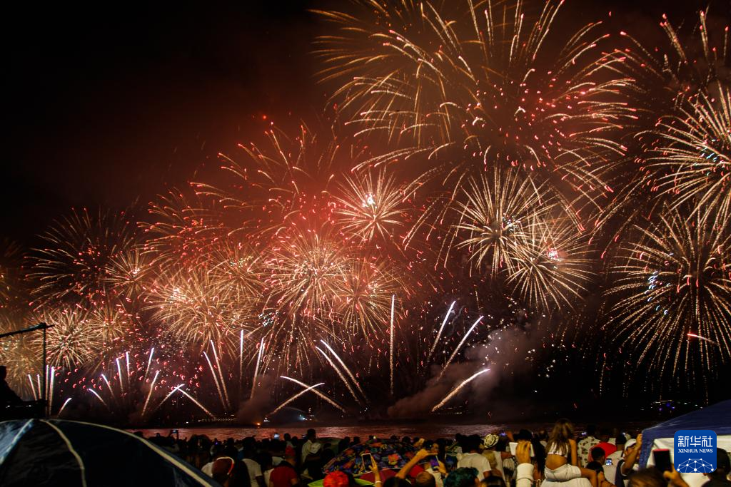 2024年1月1日凌晨,在巴西里約熱內盧科帕卡巴納海灘,人們觀看焰火表演迎新年。