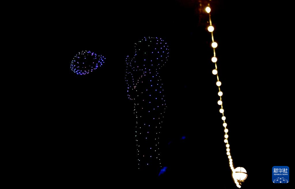 2024年1月1日凌晨,在英國倫敦舉行的新年慶?;顒由希瑹o人機組成的圖案出現(xiàn)在市中心上空。
